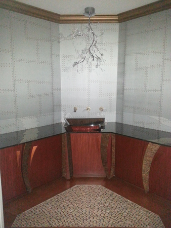 Aviator paper in a master bedroom kitchenette left this project flying high with its 45 and 90 degree corners and one of a kind cut mirror glass countertop.